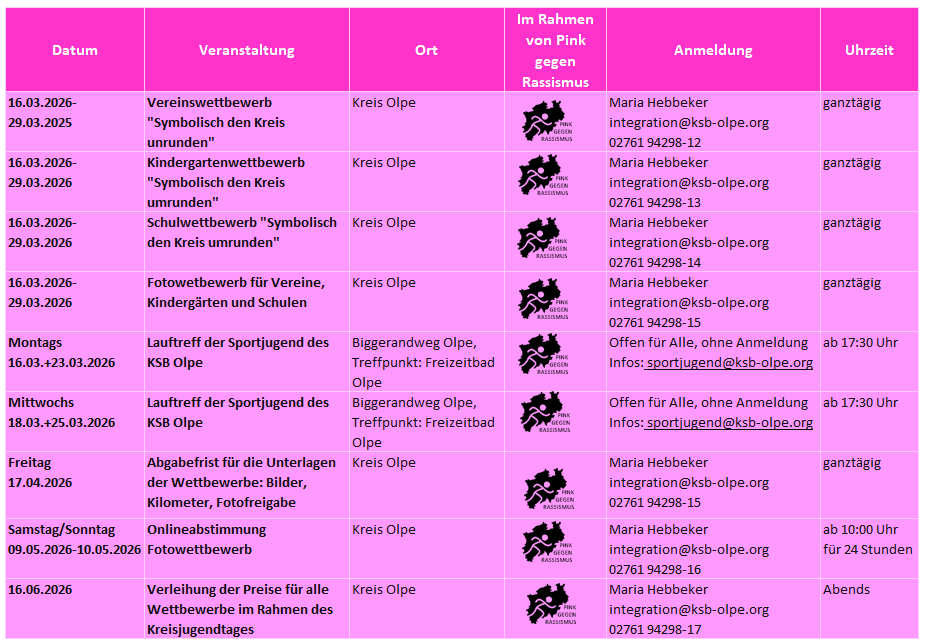Gemeinsam mit zahlreichen Sportbünden in NRW möchten wir ein eindeutiges Zeichen gegen Rassismus im Sport setzen. Alle Informationen zur Aktion der Koordinierungsgruppe, zu der auch der KSB Olpe und seine Sportjugend gehören, und der Aktionspartner aus NRW findet ihr hier: Homepage Pink gegen Rassismus